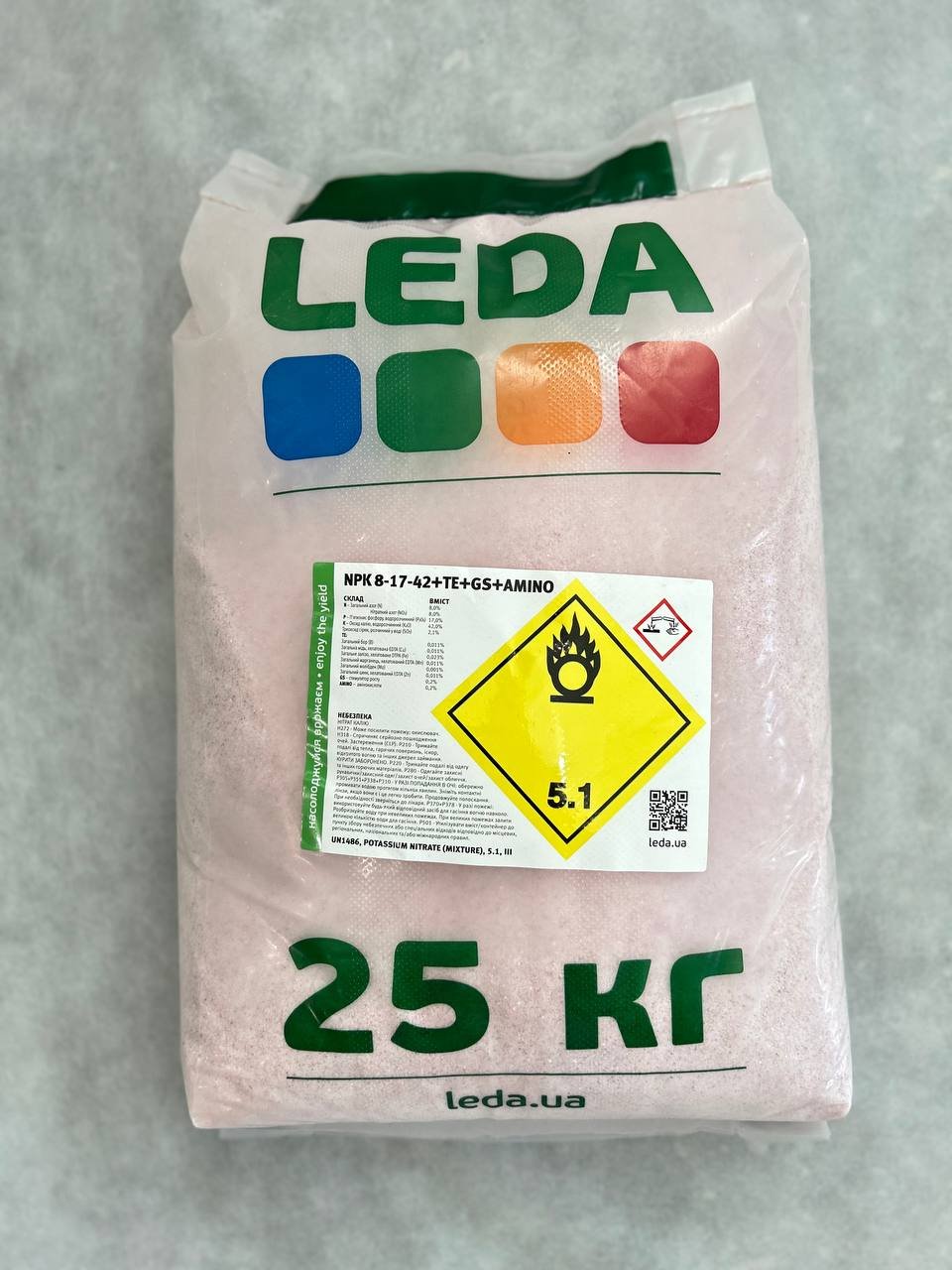 Загальна характеристика: Leda NPK 8-17-42 + TE + GS + AMINO – це комплексне мінеральне добриво з макро- та мікроелементами, стимуляторами росту та амінокислотами. Воно спеціально розроблено для підтримки рослин у період інтенсивного плодоношення, з акцентом на збагаченні поживними речовинами, необхідними для формування якісного врожаю.