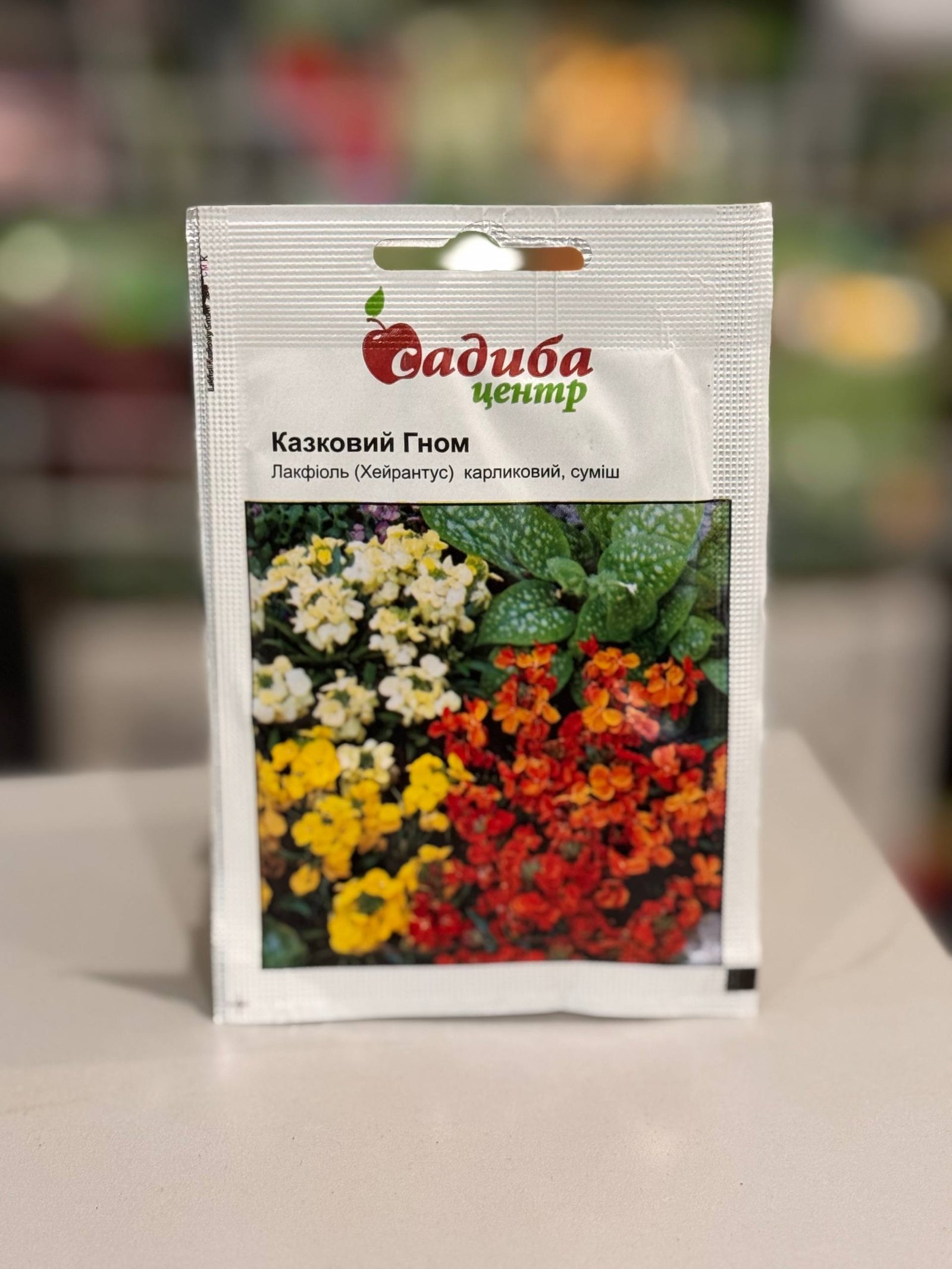 Лакфіоль Казковий гном суміш – дворічна рослина висотою до 20 см. Прикрашає сад великими, до 4 см у діаметрі, веселими квітами з надзвичайно приємним запахом. Цвіте в липні-серпні. Росте на легких родючих і вологих ґрунтах на сонячних ділянках. Використовується для озеленення в рабатках, міксбортерах, контейнерах і вазонах.