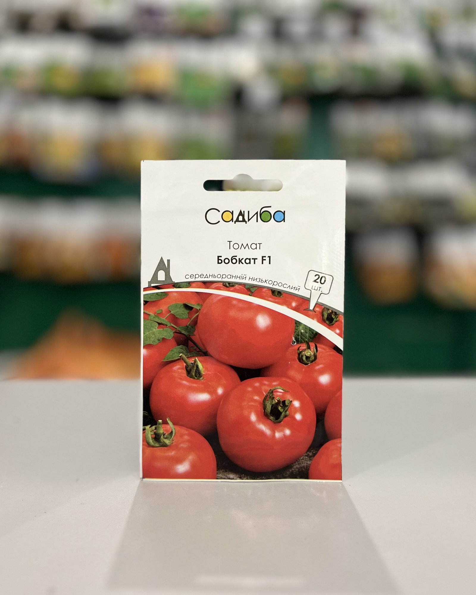 Томат Бобкат F1 – середньоранній (106-110 днів) низькорослий (до 100 см) крупноплідний (біф) томат для відкритого й закритого ґрунту. Рослина міцна, формує вирівняні за розміром, округлі плоди яскраво-червоного кольору без зелених плям, масою 250-300 г. Дуже смачні, не розтріскуються, мають «цукристу» зернисту структуру м’якушу з високим вмістом сухої речовини 5,5-6,2%. Гібрид високоврожайний 12 кг/м2, легко витримує спеку, має підвищену стійкість до хвороб, потребує підв’язки й пасинкування. Універсального використання – в свіжому вигляді, для приготування томатної пасти, соусів і соку.