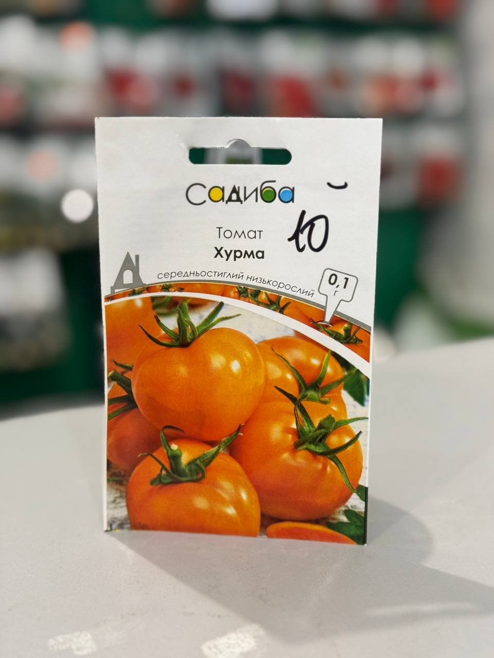 Томат Хурма – середньостиглий (100-110 днів) високоврожайний сорт для відкритого й закритого ґрунту. Сильна, потужна рослина висотою 0,8-1,0 м, при зав’язуванні великої кількості плодів потребує опори й пасинкування. Плоди помаранчево-жовтого кольору, масою до 400 г, м’ясисті, соковиті, без кислоти, з насиченим солодким смаком і свіжим ароматом. Шкірка тонка й ніжна, але міцна. Сорт цінується городниками й фермерами-професіоналами за гарну лежкість плодів і неперевершений смак. Чудовий томат для свіжого споживання й приготування соку.