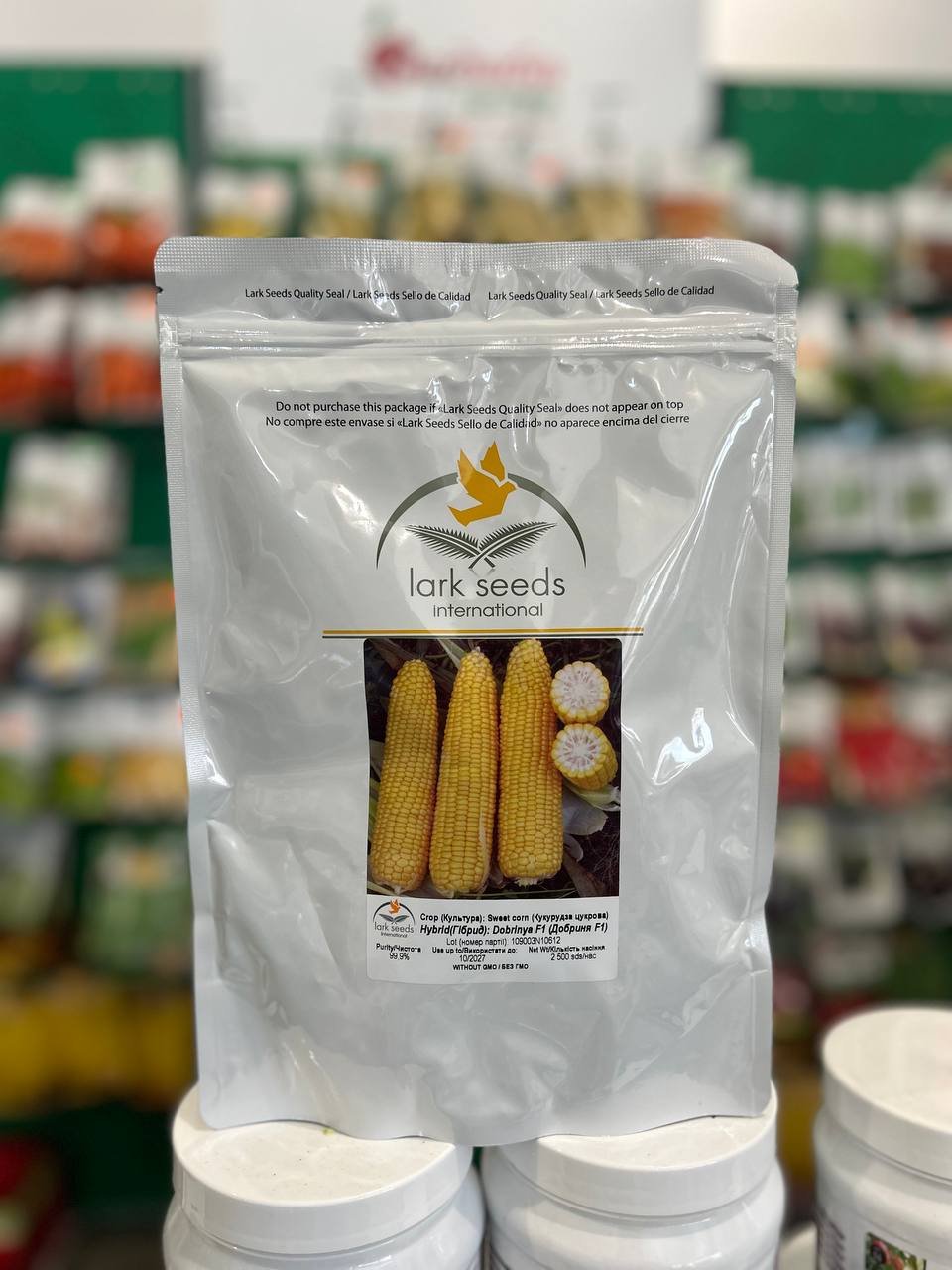 Кукурудза Добриня F1 – ранній (70 днів) суперсолодкий гібрид з високим вмістом цукрів у зерні. Рослина заввишки 170 см, на висоті 70 см формуються 1-2 качани завдовжки 24-26 см і діаметром до 6 см. Зерно золотисто-жовте, виповнене, по 15-16 рядків у початку. Гібрид адаптується до різних типів ґрунтів, стійкий до захворювань. Ідеально підходить для варіння, консервування й заморозки. За ніжну текстуру, хорошу наповненість і медово-цукровий смак користується великим попитом на фреш-ринку й в харчовій галузі.